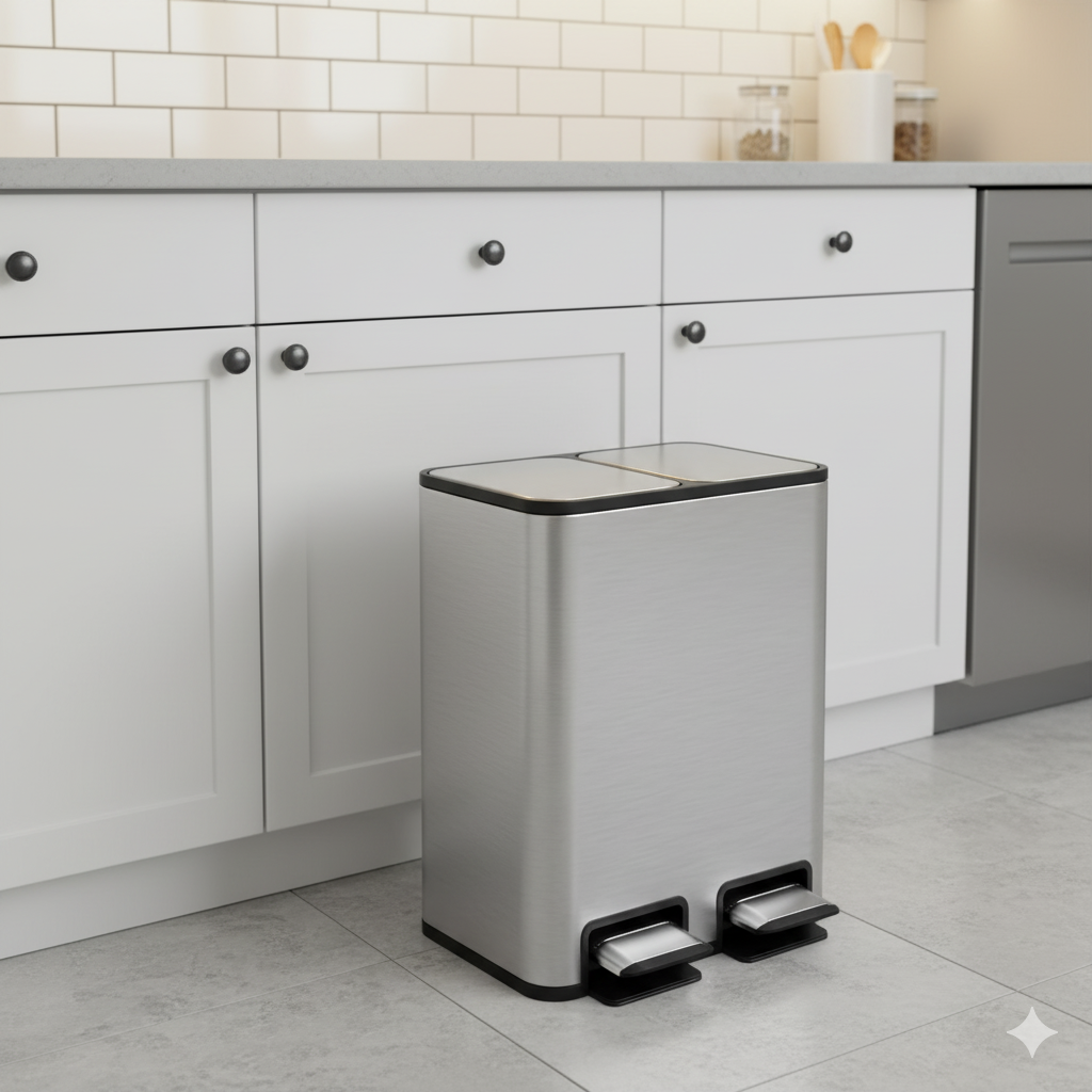 – Thùng rác inox đạp chân 40 lít 2 ngăn hoạt động bằng bàn đạp chân, không cần dùng tay mở nắp
