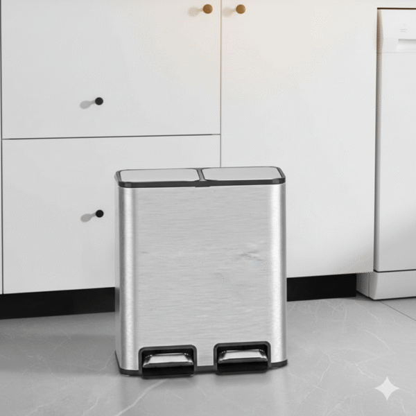 – Thùng rác inox đạp chân 60 lít 2 ngăn hoạt động bằng bàn đạp chân, không cần dùng tay mở nắp